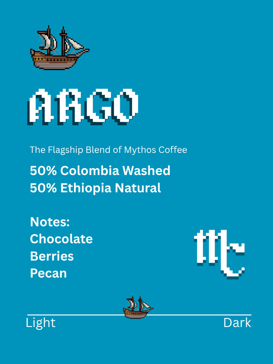 Description: On the surface, Argo is designed to be Mythos Coffees’ most versatile and approachable coffee, welcoming anyone at any point on the coffee spectrum. It’s always a medium roast blend of natural and washed coffees, crafted for balance, clarity, and everyday enjoyment.