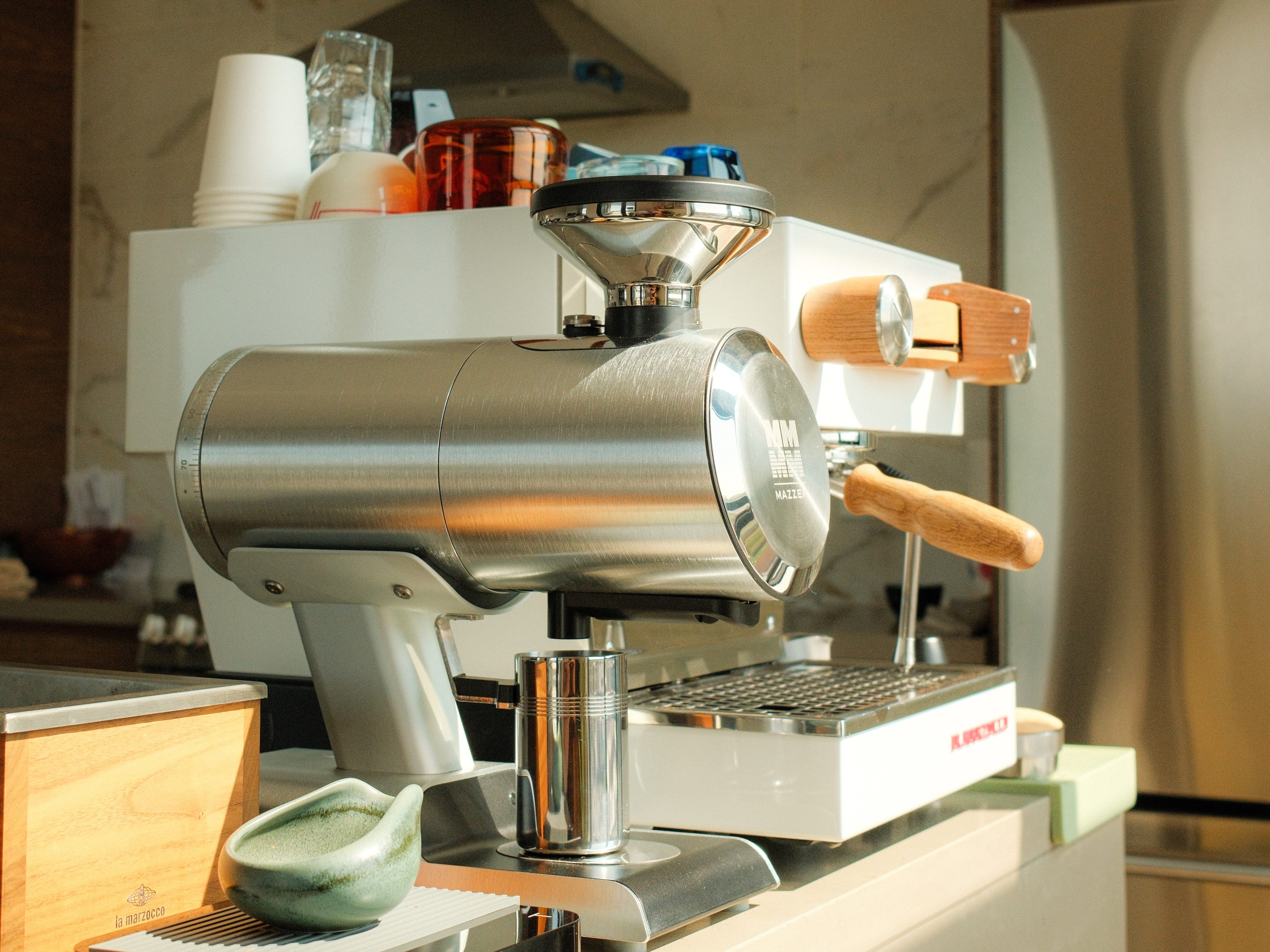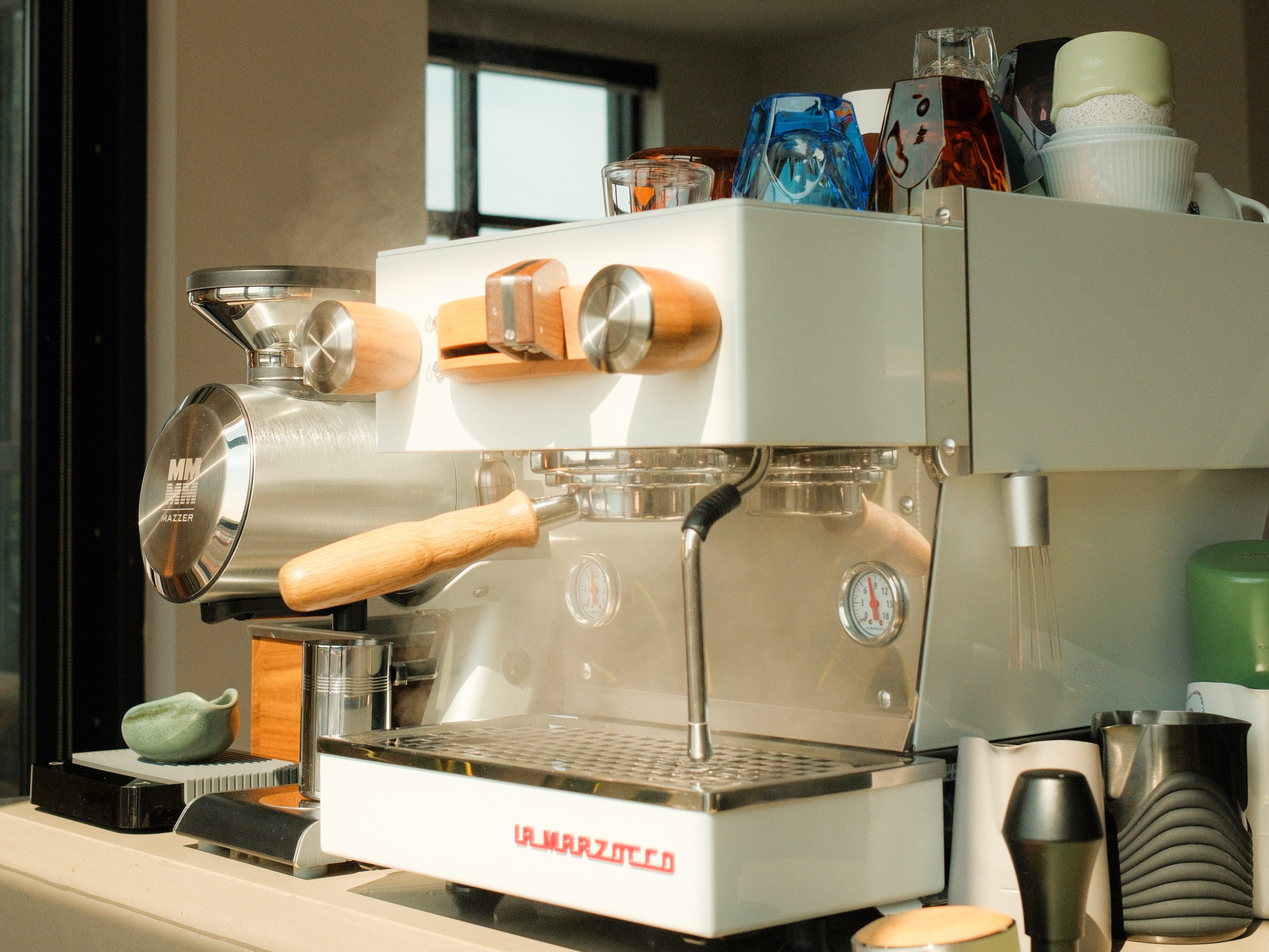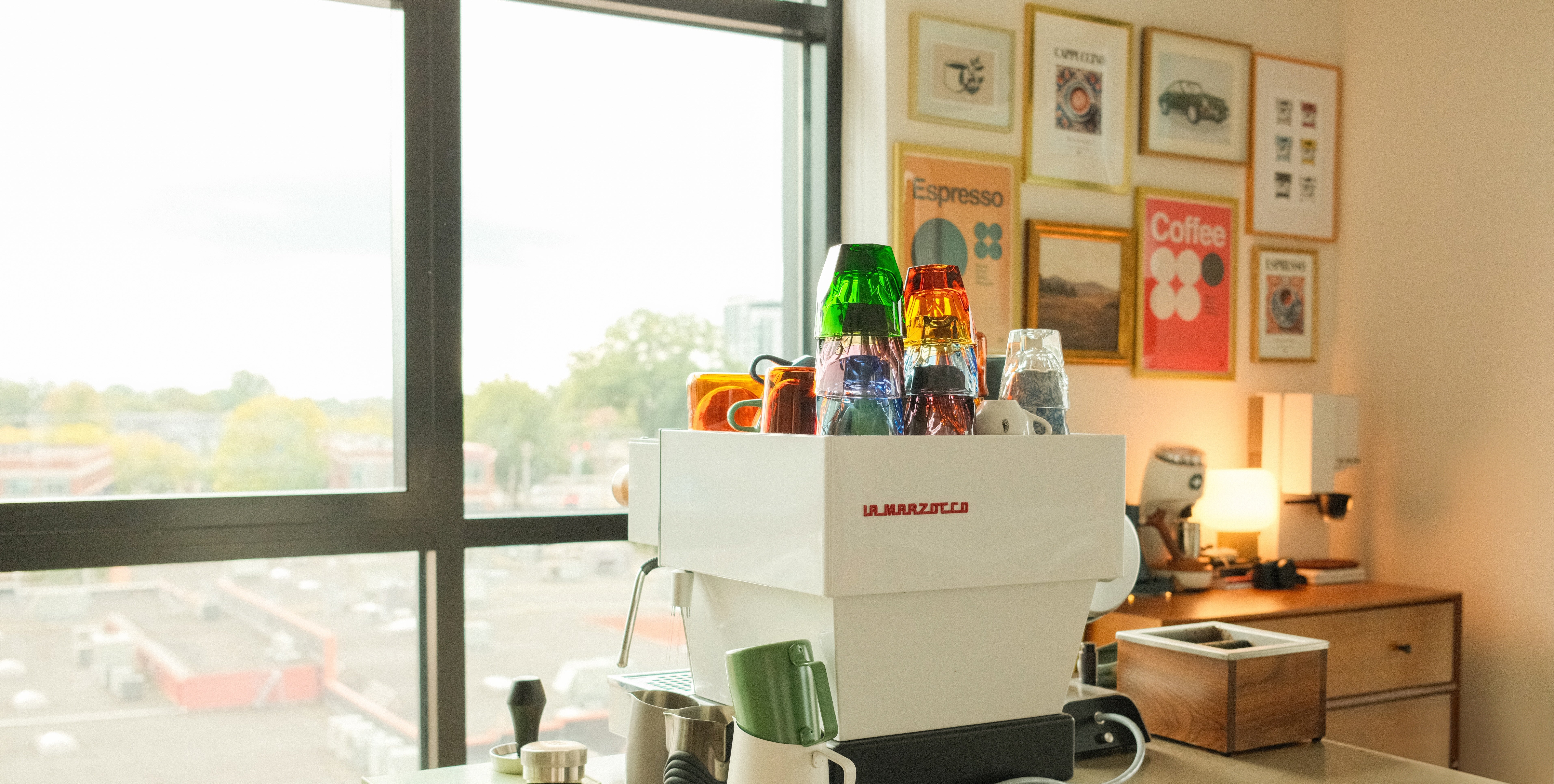Facing the window, a white Linea Mini is perfectly placed at the end of the kitchen counter—grinder adjacent —and colorful espresso cups stacked atop in no particular order.