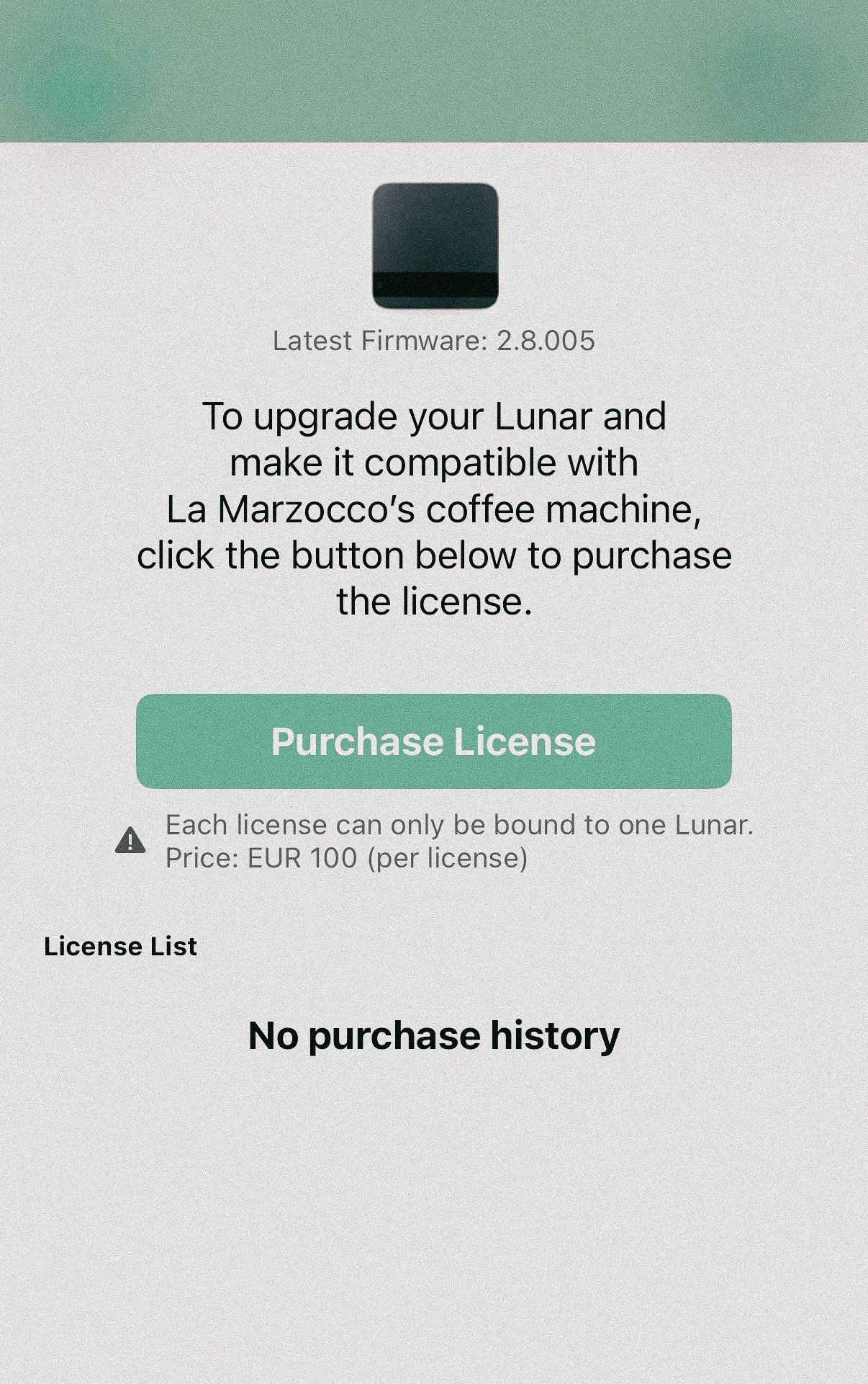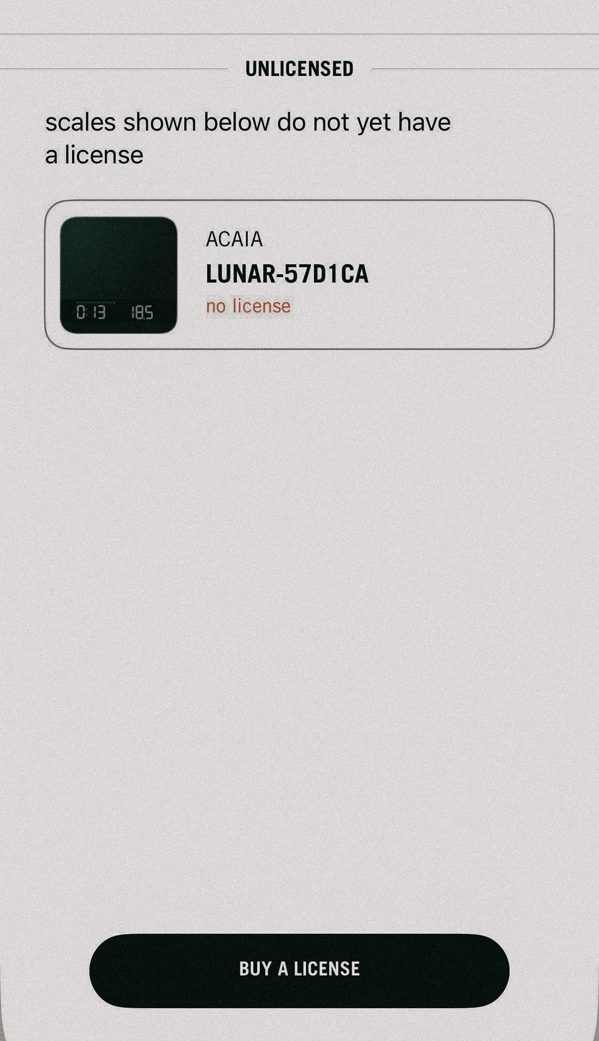 (2) The app will detect the Acaia Lunar and prompt you to purchase the upgrade license.